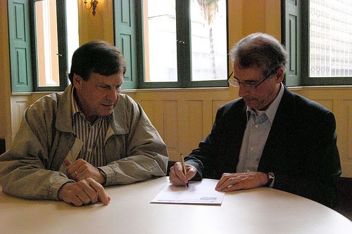 Foto: Eliseu Santos, o assassinado, e o prefeito José Fogaça (escrevendo). “Mas os mortos, agora, se levantam… e de nossas cadeiras nos empurram.”