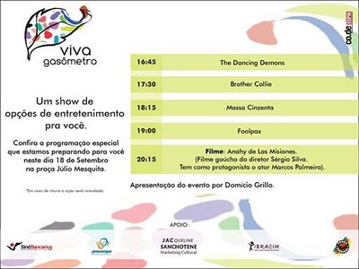 No 3º Sbado de cada mês tem evento do Movimento Viva Gasômetro na Praça Julio Mesquita (A praça do Aeromóvel), em Frente à Usina. Música e cinema na praça. Vai o Convite com as Bandas e o Filme que será exibido. Mais informações no Blog do Viva Gasômetro: http://vivagasometro.blogspot.com/