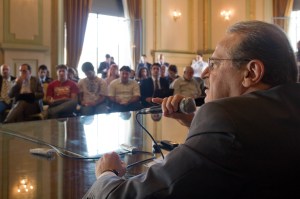 Por solicitação do governador Tarso Genro, foi organizada, na manhã desta terça-feira (05), pela Secretaria de Comunicação e Inclusão Digital (Secom), a primeira entrevista coletiva exclusiva para blogueiros no Palácio Piratini. Reunidos no salão Alberto Pasqualini, representantes de 11 dos 35 blogs inscritos foram sorteados e se revezaram em perguntas envolvendo questão fundiária, déficit zero, conselho de comunicação, mulheres no Governo, juventude, obras da Copa 2014, entre outras.