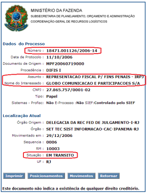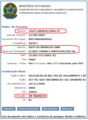 O primeiro processo é o auto de infração em si, e consta “em trânsito”, o que coloca em dúvida se foi pago e se o assunto está encerrado: