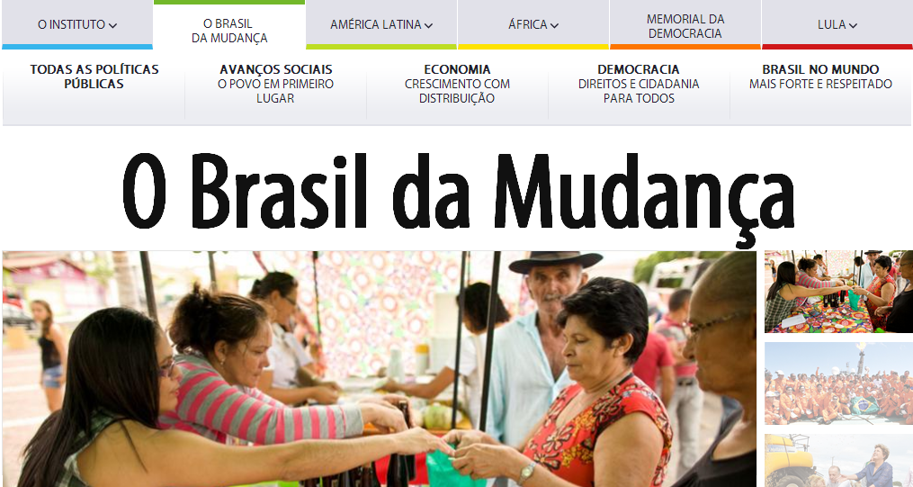 Brasil da Mudança 2O Instituto Lula, criado pelo ex-presidente Luiz Inácio Lula da Silva, lançou nesta terça-feira o portal “O Brasil da Mudança”, que funcionará como vitrine para as políticas públicas realizadas nos 12 anos de gestão petista. Na avaliação da presidente Dilma Rousseff, candidata pelo PT à Presidência, a página funcionará para que a população pense por conta própria, em crítica discreta à cobertura da imprensa.