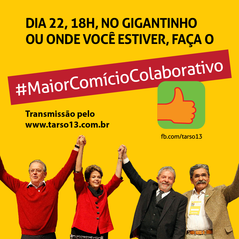 Grave um vídeo dizendo que vai participar do comício no Gigantinho. E não importa se você vai estar na sua casa, escola, trabalho ou mesmo em outra cidade. Dá pra dizer que vai assistir pelo site e acompanhar pelo Twitter e pelo Face. Mande pelo e-mail compartilhe @tarso13.com.br ou por whatsapp, no número +55 51 9730.3113.