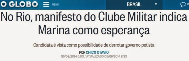 Na semana passada, o Clube Militar anunciou apoio à Marina, chamando sua candidatura de “Fio de Esperança”. Na segunda-feira, porém, o clube retirou o apoio anunciando voto em Aécio Neves (PSDB) por ser o “menos pior”.