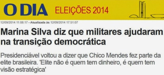 O jornal O Dia do Rio de Janeiro, mostra mais uma proeza de Marina, a sem noção… A candidata do PSB à presidência da República, Marina Silva, afirmou nesta sexta-feira em sabatina “Visões de Futuro” na Federação de Indústrias do Rio de Janeiro que os militares ajudaram na transição democrática da ditadura para a democracia.“Existem pessoas boas e corretas em todos os lugares”, disse Marina.
