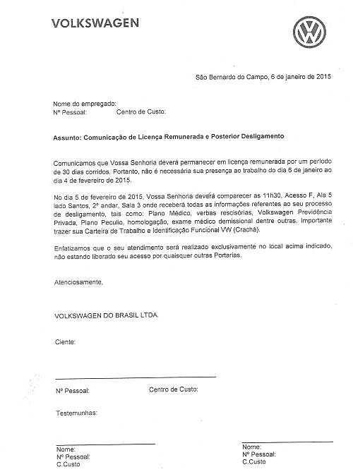 A correspondência começou a ser enviada pela empresa dia 30 de dezembro e já chegou a 800 funcionários. Além deles, a ameaça de demissão existe para outros 1300 trabalhadores, já que a Volks anunciou publicamente sua avaliação de que existem 2.100 excedentes na fábrica do ABC.