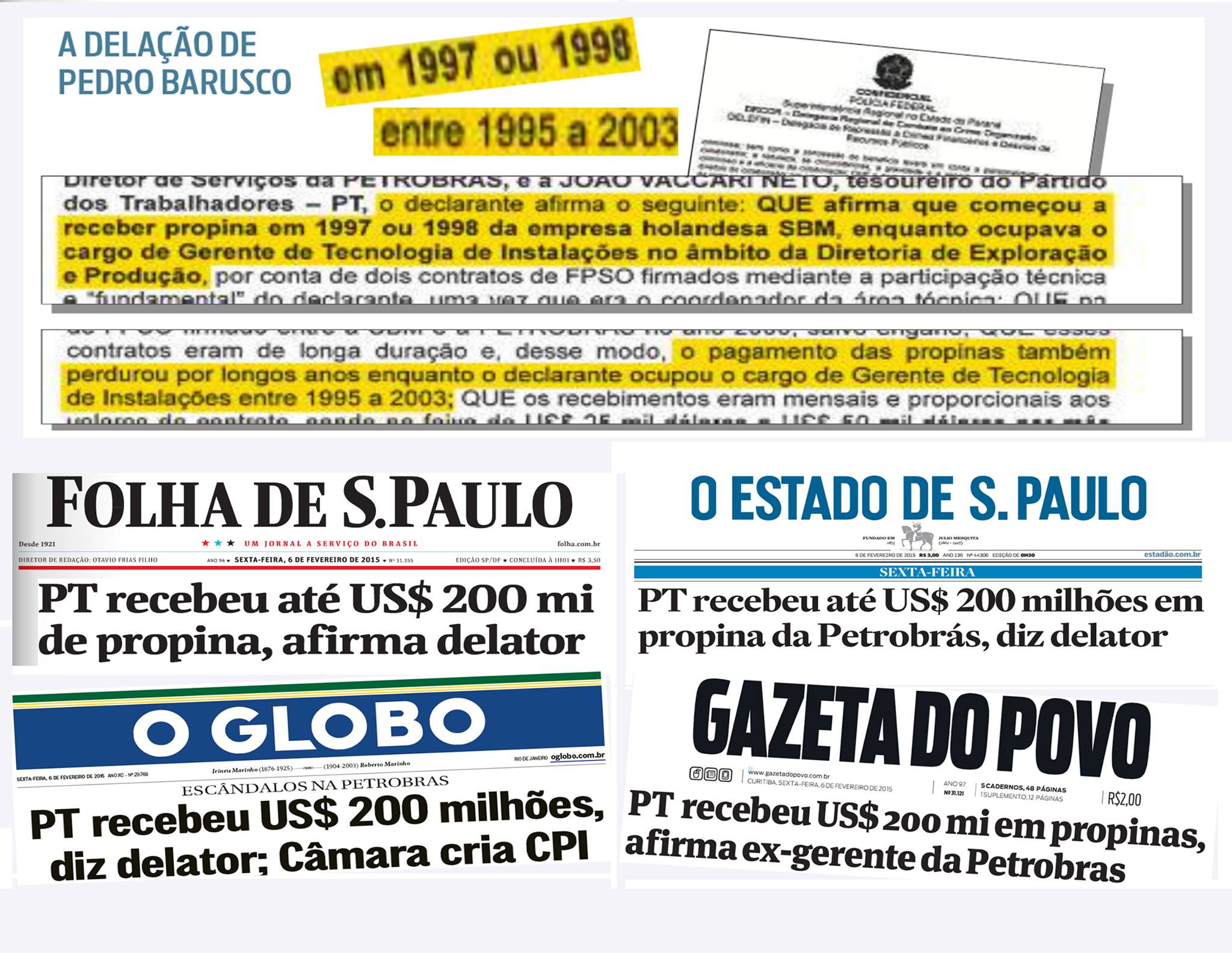 Pra quem tinha dúvidas ou acredita que o Juiz Moro, os Procuradores Paranaenses do PSDB, a PF e a mídia partidarizada estão dando os instrumentos para o Golpe Institucional, basta ler as manchetes de hoje. Mais uma vez a delação de um bandido, outro que parece que vai receber comissão e ser solto, é a deixa para uma manchete escandalosa contra o PT. Doações de empresas a partidos no Brasil são legais. Aliás, a delação diz que propina foi paga por doação legal ao PT. Como assim? Querem incriminar até as doações legais que o PT teve no período. Entendeu ou quer que desenhe? Não bastasse isto, Barusco diz que começou a receber propinas em 1997. FHC era Presidente e o tucanato mandava no país. Mas a grande manchete estampada nos jornais hoje é uma só. E se pauta por uma extração seletiva do texto. Vê aí na foto. É parte da declaração do bandido (Lembra que ele é bandido corrupto) herói da mídia e do Juiz Moro e olha as manchetes dos Jornais. Entendeu agora? Ou quer que desenhe? Tem um Golpe sendo armado. E o Golpe não é contra a corrupção coisa nenhuma. É contra o povo brasileiro. Se vingar, o Brasil perderá seu espaço preponderante na política internacional e a Petrobras, hoje já a maior produtora de Petróleo no mundo, será privatizada. Adeus Royalties do Pré Sal para a Educação. O Estado de Direito esta sendo atacado por membros da própria justiça, mancomunados com as famíglias máfio midiáticas do país, que estão sempre prontas a manterem os seus privilégios e seu oligopólio, para continuarem manipulando corações e mentes.