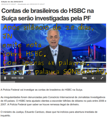 Depois de 20 dias do escândalo do HSBC suíço estourar no mundo, na edição de sábado (28) do Jornal Nacional rompeu discretamente o silêncio sobre o assunto pela segunda vez e o apresentador substituto William Waack leu uma notinha sobre o caso HSBC, de apenas 68 palavras (nenhuma delas era “sonegação”).