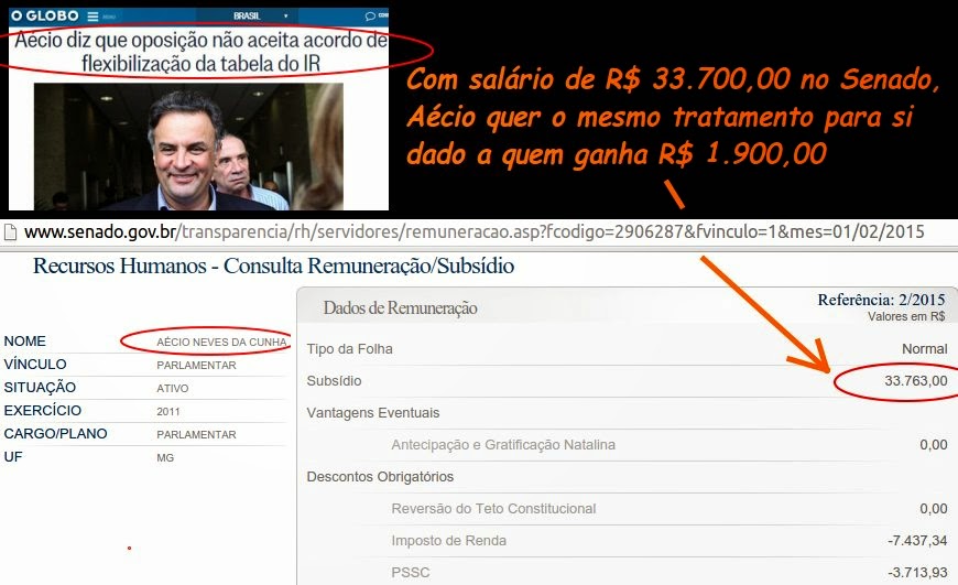 Aécio quer que quem ganha um salário de R$ 1.900 seja tratado igual a ele, que ganha quase R$ 34 mil (fora outras fontes de renda que ele não fala para o eleitor).