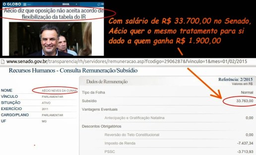 Feliz detentor de um polpudo salário de R$ 33.763,00 no Senado, Aécio Neves (PSDB-MG) está batendo panela contra a proposta de reajustar a tabela de imposto de renda aliviando para os trabalhadores de menor renda.