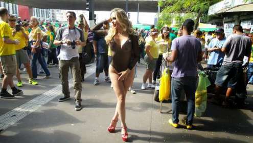 A empresária Juliana Isen, 30 anos, ganhou fama no último dia 15 de março depois de fazer um topless durante o primeiro grande protesto contra a presidente Dilma Rousseff (PT), na Avenida Paulista, em São Paulo. O episódio rendeu a ela um convite pra posar nua e ser capa da revista Sexy, e a empresária aproveitou a nova manifestação que acontece neste domingo para divulgar o seu novo trabalho.
