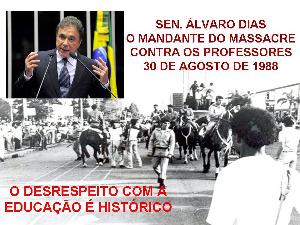 O senador Álvaro Dias (do mesmo PSDB do Richa) também costumava colocar a tropa na rua para bater em professores. Todos os anos, no dia 30 de agosto, os professores paranaense lembram o episódio do “massacre” dos grevistas; em 30 de agosto de 1988, quando o tucano governava o estado, o Batalhão de Choque e a Cavalaria da PM foram utilizados para dispersar educadores em greve que protestavam em frente ao Palácio Iguaçu (sede do governo estadual). Vê abaixo matéria do Blog do Esmael, de 2014 sobre o tema.