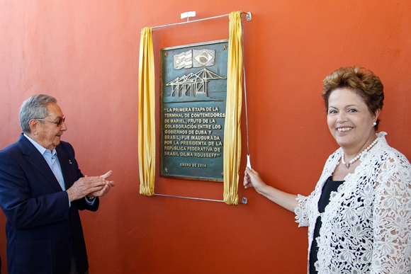 27/01/2014. Presidenta Dilma Rousseff e o Presidente de Cuba Raúl Castro durante descerram placa inaugural do Porto de Mariel.