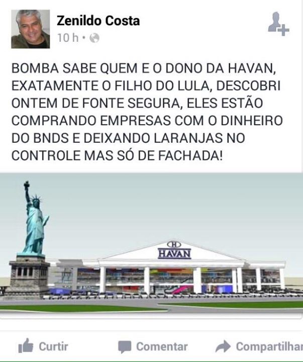 Como diz o ditado, “mentiras quando ditas várias vezes, acabam se tornando verdades”.Estamos colocando um ponto final no assunto. Estamos respondendo hoje, a todos nossos clientes e amigos, tomarem conhecimento que, o post do Sr Zenildo Costa, de Curitiba, afirmando que a Havan, pertence ao filho do Lula, não é verdadeira.