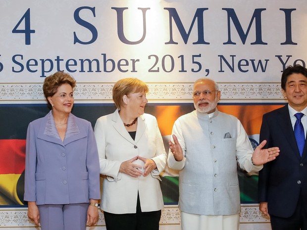 Além do Brasil, integram o G4 a Alemanha, a Índia e o Japão. Após o encontro de Dilma esta manhã com a chanceler alemã, Ângela Merkel, e os primeiros-ministros da Índia e Japão, Narendra Modi e Shinzo Abe, o Itamaraty divulgou uma nota conjunta do grupo defendendo a necessidade de avanços na reforma do Conselho.