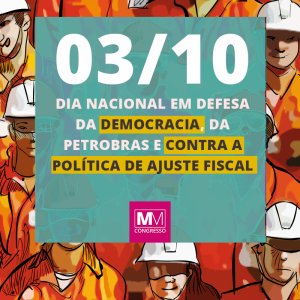 No próximo sábado, dia 03 de outubro, é dia de lutar pela garantia da democracia no nosso país, em defesa da Petrobras, de uma nova política econômica e contra o ajuste fiscal.