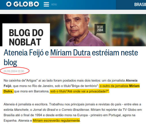 Três meses depois, em setembro de 2004, o Blog do Noblat ainda não era contratado da Globo (nem do Estadão), e anunciou duas novas colaboradoras: Atenéia Feijó e Miriam Dutra.