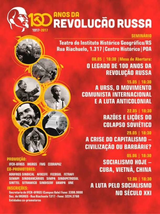 O Instituto Histórico e Geográfico do Rio Grande do Sul (IHG/RGS), o Instituto de Filosofia e Ciências Humanas da URGS (IFCH/UFRGS), a Fundação Mauricio Grabois (FMG) e o Centro Brasileiro de Solidariedade aos Povos e Luta pela Paz (CEBRAPAZ), com mais de uma dezena de outras entidades, abriram em Porto Alegre, dia 8 de maio, um seminário composto de seis encontros de estudos e debates sobre os 100 anos da Revolução Russa.