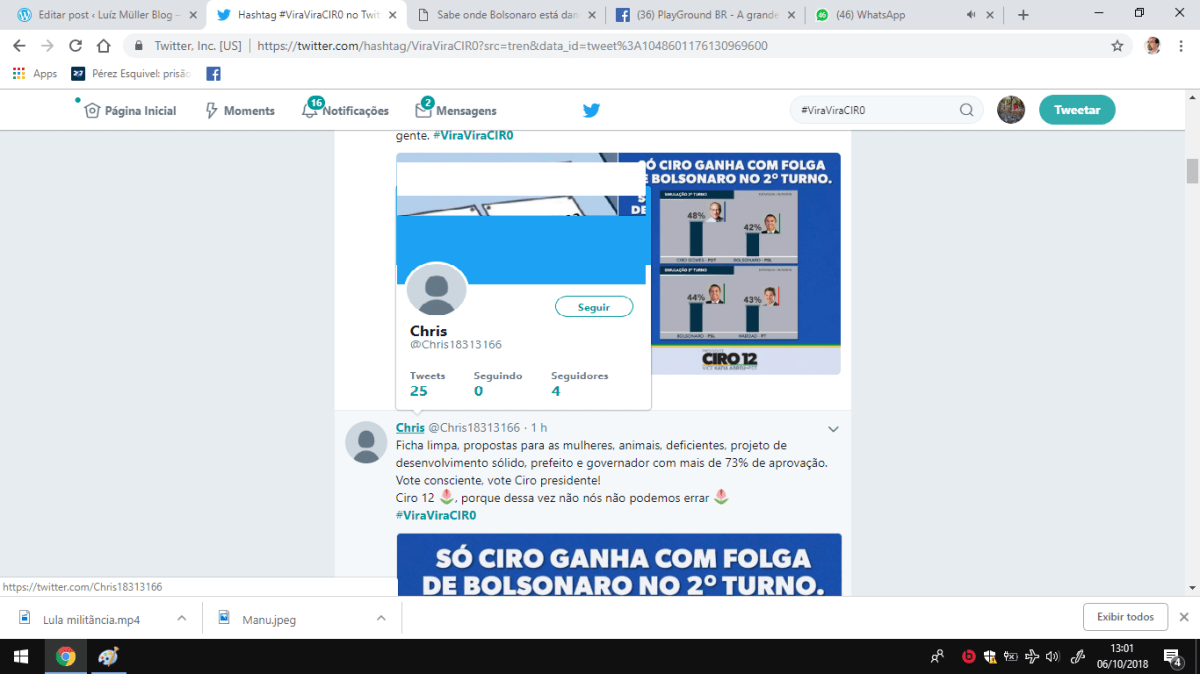 Na hastag #ViraViraCiro, basta clicar e ver a quantidade de bots presentes ali, além de perfis absolutamente estranhos, como gente que tem o Cabeçalho ou a foto do Perfil Lula, mas chamando voto em Ciro