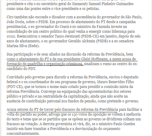 Ciro: Perdemos a eleição e o que resta a nós, da oposição, é tentar exponencializar a nossa precária força para contenção de danos. Isso para o bem do nosso povo, porque tem uma turma aí que acha que é o melhor para o povo se f… para você poder extrair disso o sucesso eleitoral. Meu jogo nunca foi esse. Nos acertamos com Rodrigo Maia, avançamos, admitimos assumir comissões e discutir. Rogério Marinho perguntou ao Bolsonaro se podia me consultar. Ele autorizou. Aí convidou publicamente para não ter esse negócio de clandestinidade e eu mandei um assessor. Aí a petezada gritou..