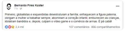 Olha a loucura do sujeito. O cara culpa os tais “globalistas” de George Soros, que ele compara com “esquerdistas”, do atentado de Suzano. É muita loucura num paragrafo só.