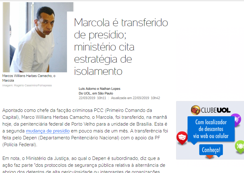 Esta é a segunda mudança de presídio em pouco mais de um mês. A transferência foi feita pelo Depen (Departamento Penitenciário Nacional) com o apoio da PF (Polícia Federal). Em nota, o Ministério da Justiça, ao qual o Depen é subordinado, diz que a ação faz parte “dos protocolos de segurança pública relativa à alternância de abrigo dos detentos de alta periculosidade ou integrantes de organizações criminosas entre as unidades prisionais federais”