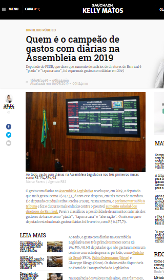 Ao todo, gasto com diárias na Assembleia Legislativa nos três primeiros meses soma R$ 194.556,90 gasto com diárias na Assembleia Legislativa revela que, em 2019, o deputado que mais gastou soma R$ 14.133,36 com essa despesa, em três meses de mandato. É o deputado estadual Pedro Pereira (PSDB). Nesta semana, oparlamentar subiu à tribuna e fez o discurso mais enfático contra o possível aumento salarial dos diretores do Banrisul. Pereira classificou a possibilidade de aumentos salariais dos gestores do banco como “piada”, “tapa na cara” e “aberração”. O mês em que o deputado estadual mais gastou diárias foi fevereiro, com R$ 6.477,79.