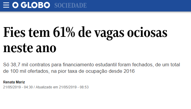 A Notícia de O GLOBO não deixa Dúvidas FIES TEM 61% DAS VAGAS OCIOSAS EM 2019. Além de reduzir verbas na educação, as que ainda existem, como o FIES – Financiamento Estudantil – para Estudantes de famílias de Classe Média, se tornou proibitivo pela fórmula de pagamento, eliminação de qualquer tipo de carência antes do inicio do pagamento pós formatura e proibição de acesso para jovens de famílias que estejam “no SPC”, além de empecilhos burocráticos que fizeram muitas universidades privadas não aderirem mais ao Sistema do FIES. Repito a seguir artigo publicado por este blogueiro em fevereiro, mais atual que nunca: