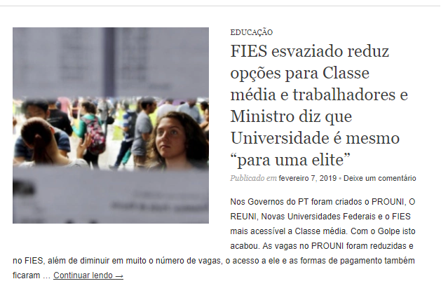 Derrubado o PT do Governo, as vagas do PROUNI foram reduzidas, O REUNI que era a apliação de vagas, inclusive noturnas nas Universidades Federais, foi desativado e o FIES reduzido durante o golpista Governo Temer. Na continuidade agora no Governo Bolsonaro, o Ministro da Educação já disse que a Universidade esta destinada a Elite e que portanto os filhos dos trabalhadores e os filhos da maioria da Classe Média estão fora.