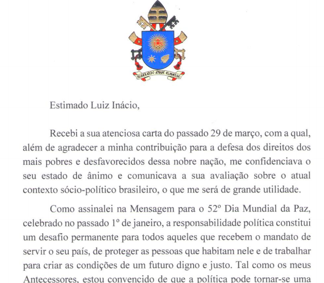 Um pensamento sobre “Papa envia carta a Lula: “No fim a verdade vencerá a mentira”