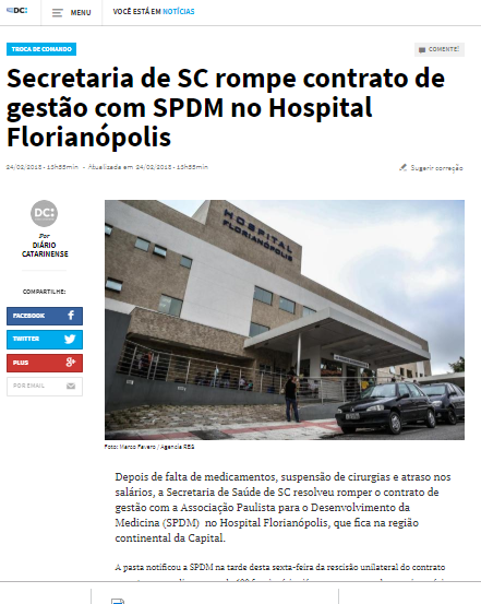 A SPDM (Associação Paulista para o Desenvolvimento da Medicina), que venceu a concorrência para assumir a gestão dos pronto-atendimentos Bom Jesus e Lomba do Pinheiro, teve contratos cancelados pelo estado de Santa Catarina, quando foi responsável pelo Hospital Florianópolis, o Hospital Regional de Araranguá e pela gestão do Samu. Esta é a “inovação” que o prefeito Marchezan quer trazer para Porto Alegre.