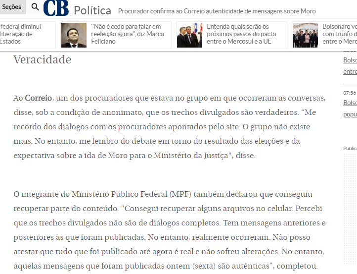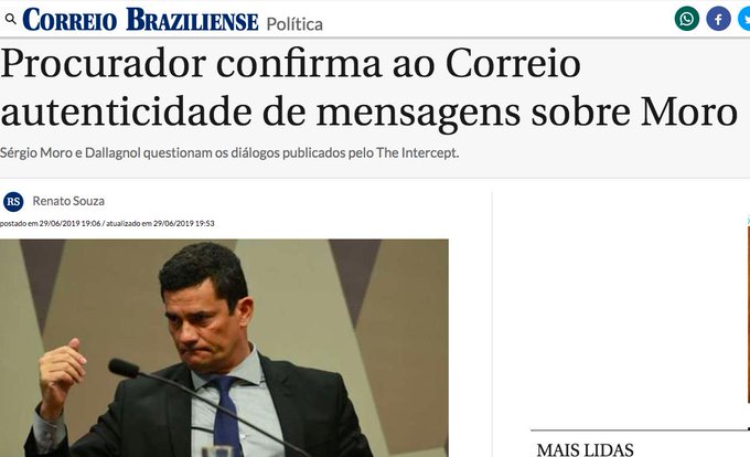 As conversas de Moro, Dallagnol et caterva, vazadas pelo Intercept são verídicas. É o que confirma Procurador que participou das conversas. E ficam provados os crimes de Moro. A coisa é tão escrachada de parte de Moro, que até mesmo os procuradores, ansiosos por manter os ataques a Lula e ao PT, pediram pra Moro maneirar. Ele não maneirou. E seu golpismo seguiu, atropelando até os parceiros do Ministério Público, que no entanto se acadelaram por que seu objetivo maior era o de combater o PT e Lula e em nenhum momento a ´época externaram sua contrariedade ao mando de Moro, mesmo quando este mandou afastar uma Procuradora das audiências com Lula. Agora, em pleno Jornal associado ao liberalismo e ao golpismo, o Correio Braziliense, um Procurador confirma de novo o que já esta claro nas conversas vazadas, mas só a elite tupiniquim e seu judiciário covarde e hipócrita não quer reconhecer. Lula Já deveria estar solto. E a Lava Jato anulada. Veja os prints da Matéria de Hoje do Correio Braziliense e tire suas próprias conclusões.