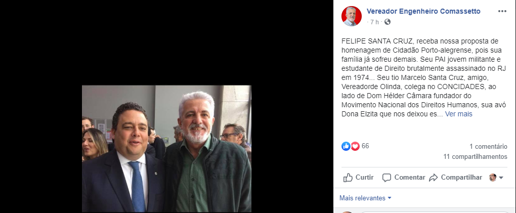 FELIPE SANTA CRUZ, receba nossa proposta de homenagem de Cidadão Porto-alegrense, pois sua família já sofreu demais. Seu PAI jovem militante e estudante de Direito brutalmente assassinado no RJ em 1974… Seu tio Marcelo Santa Cruz, amigo, Vereadorde Olinda, colega no CONCIDADES, ao lado de Dom Hélder Câmara fundador do Movimento Nacional dos Direitos Humanos, sua avó Dona Elzita que nos deixou este ano nos seus 105 anos sempre lutando pela memória de seu filho e de todos desaparecidos… Tortura nunca mais… E nossa homenagem a todos os Juristas do Brasil que defende e Honram nossa Constituição e nossas Leis… Receba nossa HOMENAGEM…