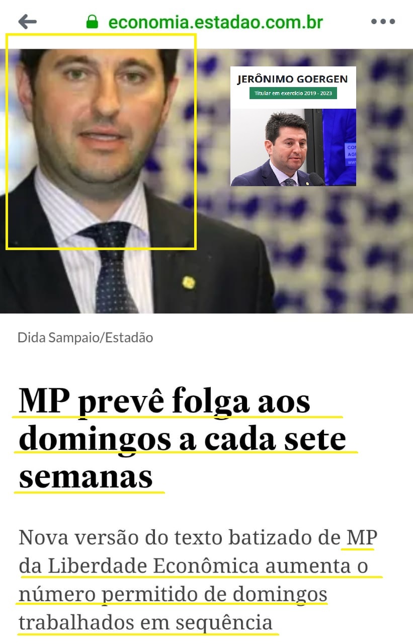 Um Deputado supostamente cristão é o relator da MP 881, que acaba com o Domingo como dia de descanso, propondo que o trabalhador tenha direito a apenas um domingo a cada 7 semanas para passar com a família e acaba com os direitos que ainda restam ao trabalhador. O Deputado Jerônimo Goergen a mando de Bolsonaro, esta prestes a legalizar o trabalho escravo no Brasil, sem direito nemhum e descanso só de 7 em 7 semanas.