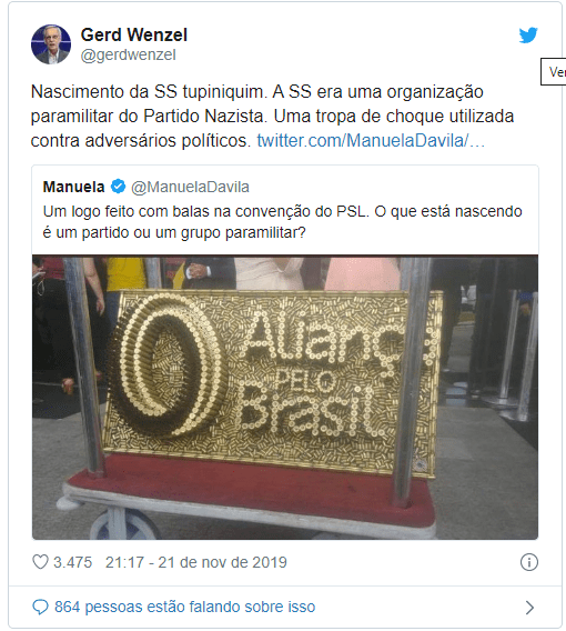 O jornalista alemão Gerd Wenzel, comentarista dos canais ESPN, comparou o evento de lançamento do projeto de novo partido de Jair Bolsonaro, Aliança Pelo Brasil (APB), com o nascimento do SS, um grupo paramilitar nazista fundado por Adolf Hitler. Wenzel fez a analogia ao criticar nesta quinta-feira (21) o logo do partido formado por cápsulas de balas de diversos calibres.