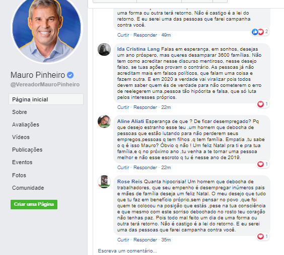 Segue o Post do referido, que ao que tudo indica, acabará apagado, e os comentários didáticos de seguidores da página do”prestigioso” Vereador.