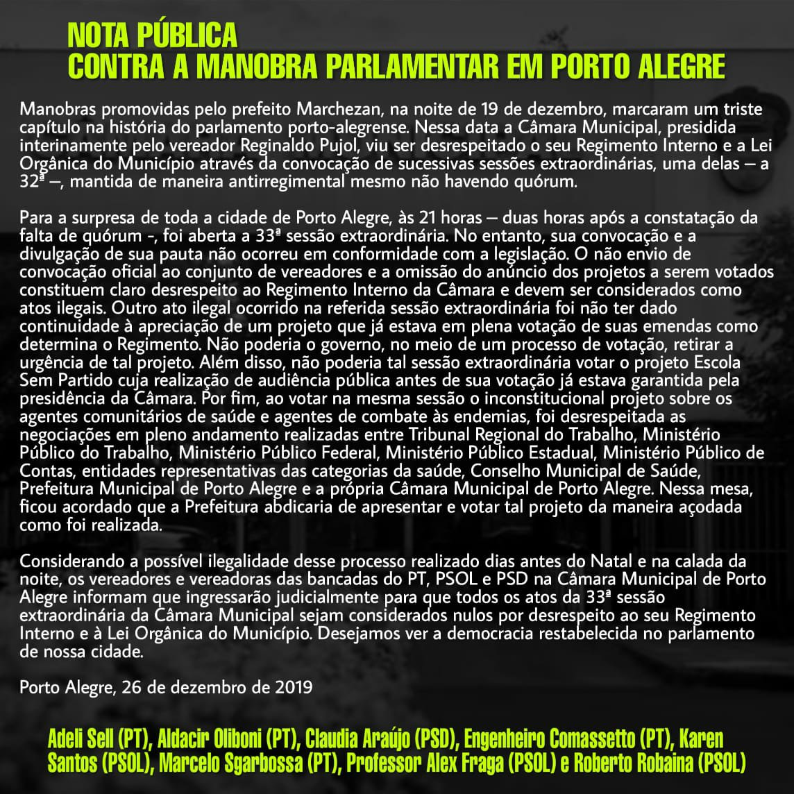 Leia e Compartilhe a nota assinada pelos vereadores Adeli Sell (PT), Aldacir Oliboni (PT), Claudia Araújo (PSD), Engenheiro Comassetto (PT), Karen Santos (PSOL), Marcelo Sgarbossa (PT), Professor Alex Fraga (PSOL) e Roberto Robaina (PSOL).