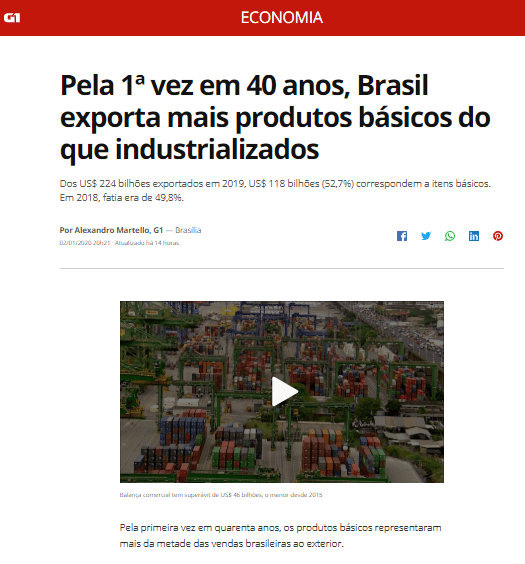Tá na Manchete. Além de exportarmos menos, o Brasil exportou mais produtos “básicos” (grãos, frutas, ferro, petróleo sem transformar em produtos, ou seja, sem agregar valor.