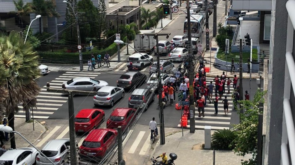 Entregadores de aplicativo bloquearam ruas e avenidas próximas à Praça Portugal, no Bairro Aldeota, em Fortaleza. A manifestação teve início por volta das 11 horas desta segunda-feira (6). Por volta das 13h30, a Avenida Dom Luís já havia sido desobstruída.