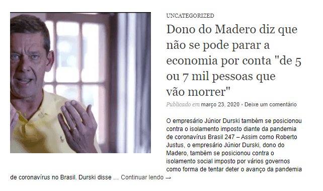 Susto Dias antes da publicação, no domingo (22), da Medida Provisória que vai mudar as relações trabalhistas no estado de calamidade, cresceu a tensão de trabalhadores com receio de perder suas vagas. Falas de empresários e altos executivos sobre o home office e o efeito do coronavírus na economia pioraram o clima. Um dos que se manifestou publicamente sugerindo que os funcionários deveriam ter medo de perder o emprego foi Alexandre Guerra, sócio dos restaurantes Giraffas.De pernas “Você que é funcionário, que talvez esteja em casa numa boa, numa tranquilidade, curtindo um pouco esse home office, esse descanso forçado, você já seu deu conta que, ao invés de estar com medo de pegar esse vírus, você deveria também estar com medo de perder o emprego?”, disse Guerra em vídeo divulgado nas redes sociais.Para o ar Procurado pela coluna, o empresário afirma que, no vídeo, ele não se referia ao Giraffas e que não é o único sócio da rede.Tranquilo Guerra, que foi candidato ao governo do Distrito Federal pelo Partido Novo em 2018, afirma que sua fala foi feita em nome de uma rede de pequenos empreendedores da qual faz parte. Segundo ele, o Giraffas vai atravessar a crise tranquilamente e as vagas estão seguras.Deserção Entre funcionários do Santander, reverberou durante o fim de semana uma declaração feita pelo presidente do banco, Sergio Rial. Na sexta-feira (20), o executivo falou em deserção para se referir a quem quis trocar o trabalho presencial pelo home office na crise do coronavírus.Absenteísmo Procurado pela coluna, o Santander disse que tem tomado ações para mitigar o impacto da pandemia, como antecipação de 13º. “Dentro desse contexto, discutiu-se o cuidado necessário que cada um deve ter com absenteísmo, dadas as diferentes e compreensíveis reações humanas”, afirmou em nota.Expediente Luciano Hang, dono da Havan, postou nas redes sociais um vídeo com o alerta: “Se perder o emprego, pode demorar de cinco a dez anos para conseguir um novo. Para mim, Luciano, é muito simples”, afirma ele.Praia O empresário diz que, apesar da crise, ele teria dinheiro para ir para a praia. Mas teria de mandar 22 mil colaboradores embora. “Um emprego no comércio são cinco empregos para trás. Ou seja, se eu tenho 20 mil colaboradores hoje, eu tenho 120 mil pessoas dependendo da Havan”, afirma o empresário.