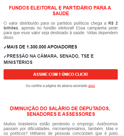 Mas o que me faz escrever este artigo é o email que recebi, reiterando outros anteriores, dizendo que eu faço parte da “comunidade deles” e que eu deveria aderir a um abaixo assinado que pede que o Fundo Eleitoral e Partidário sejam eliminados e o dinheiro repassado a Saúde. Notem que o Governo Bolsonaro cortou mais de 20 Bilhões da Saúde, e mesmo com estes cortes, do que sobrou, até agora aplicou pouco mais de 10% do que deveria aplicar na Saúde, apesar do CoronaVírus, como deixa claro a matéria do Estadão neste link.