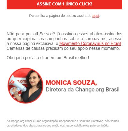 Mônica Souza, que no Email se apresenta como Diretora do Change.org, “curiosamente” defende exatamente o que defendem as tropas de Bolsonaro, Moro e os militares, qual seja, criminalizar a política aos olhos do povo, já que “não abrem mão do Fundo Partidário e nem dos salários” e portanto serão taxados como “corruptos” e outros que tais, deveria assistir, e se já viu e continua assinando coisas o tipo, deveria assistir de novo.