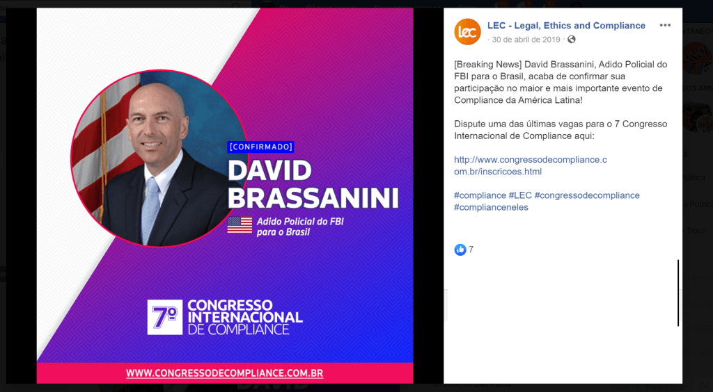 Embora as duas maiores investigações da Lava-Jato pelo Departamento de Justiça (DOJ) norte-americano já tenham terminado, com os acordos da Odebrecht e Petrobras, o FBI ainda tem muito a fazer para investigar corrupção no Brasil, nas palavras do chefe do FBI no país, David Brassanini, em palestra no 7º Congresso Internacional de Compliance, em maio de 2019, em São Paulo.