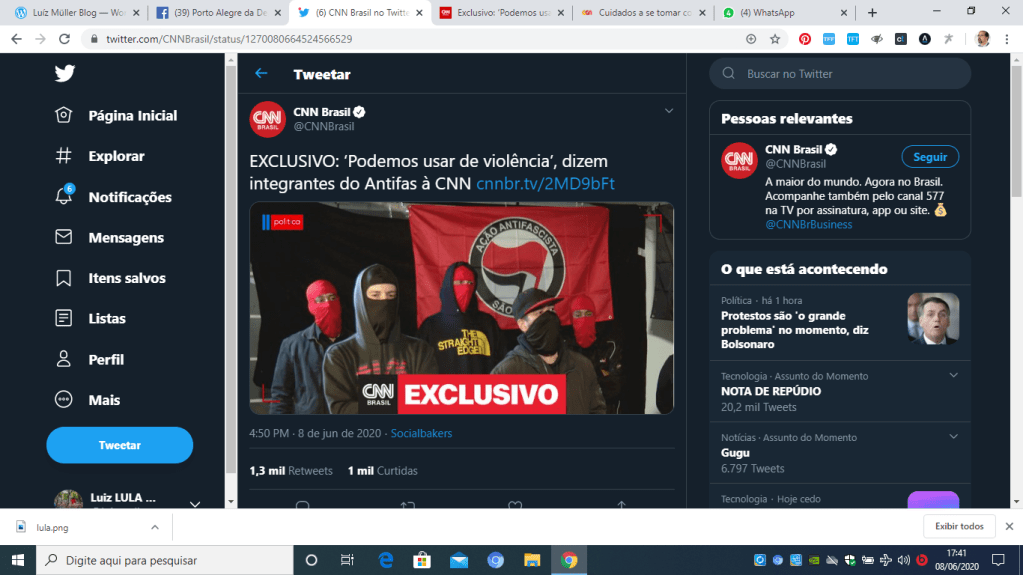Este humilde blogueiro tem memória. ANONYMOUS, ANTIFA e outros que tais estavam na origem daquele fatídico junto de 2013. Vários artigos publiquei aqui no Blog sobre o tema. Mas chega Junho de 2020, 7 anos depois, e eis que os movimentos se repetem. Começam pequenininhos, de preto e vão crescendo até ganhar a simpatia de parcela da juventude e até da velha guarda da esquerda e dos petistas. E aí, fazendo um monitoramento bem amador das redes, eis que nesta segunda-feira me deparo com a postagem da qual faço o Print e disponibilizo o link pra quem quiser ler: