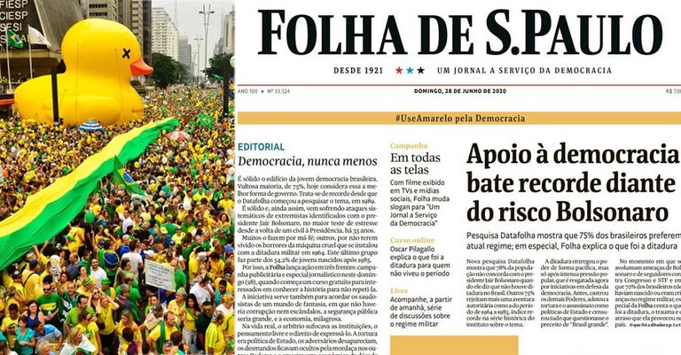 “Assim, as vitrines das edições dominicais trarão uma faixa dessa cor com os dizeres #UseAmarelo pela Democracia, e o slogan da Folha desde 1961, UM JORNAL A SERVIÇO DO BRASIL, passa temporariamente para UM JORNAL A SERVIÇO DA DEMOCRACIA até as próximas eleições presidenciais”, finaliza o editorialista, sinalizando que o jornal também será tolerante com o governo de Jair Bolsonaro, assim como defende o ex-presidente Fernando Henrique Cardoso.