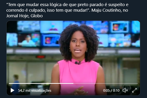 Maju Coutinho mandou Papo Reto no Jornal Hoje. Comentando uma reportagem sobre um guri negro condenado a 67 anos de prisão em Brasíl mas que era inocente. Ela mandou ver: “Tem que mudar a mentalidade de que preto parado é suspeito e correndo é culpado”.