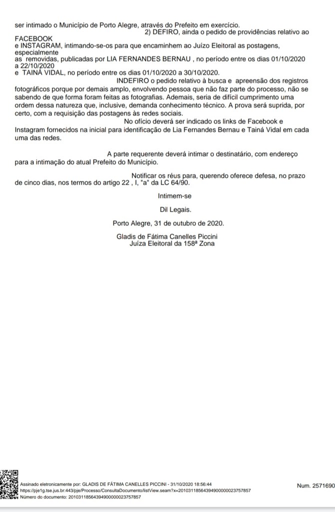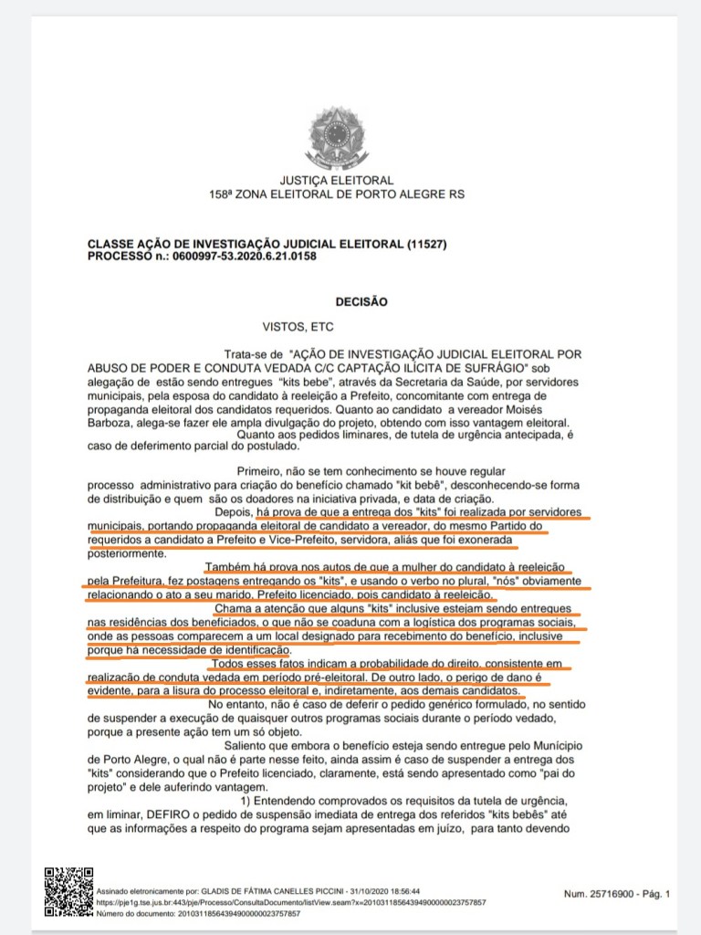 A juíza Gladis de Fátima Canelles Piccini, da 158a Zona Eleitoral, deferiu nesse sábado (31), a suspensão da entrega dos chamados “Kits Bebês” e que se tomem providências quanto às postagens das redes sociais da servidora Lia Bernau e Tainá Vidal, esposa do prefeito e candidato Nelson Marchezan Jr. Na decisão, a juíza narra que os kits foram entregues “por servidores municipais, pela esposa do candidato à reeleição a Prefeito, concomitante com entrega de propaganda eleitoral dos candidatos requeridos”. Os advogados da candidatura de Nelson Marchezan Jr, ainda não estão cientes da decisão, mas garantem que estudarão as medidas cabíveis e apresentarão a defesa no tempo oportuno.
