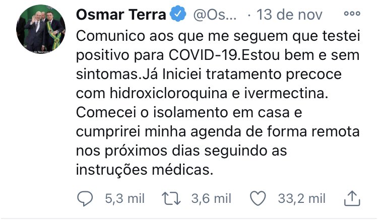 Osmar Terra é o golpista gaúcho que como Ministro destruiu boa parte da estrutura da Assistência Social no Brasil. É um negacionista que disse que COVID-19 é uma gripe e ia passar logo. No começo de novembro pegou a doença e aí foi se tratar com a receita do Bolsonaro e do Trump: Cloroquina!