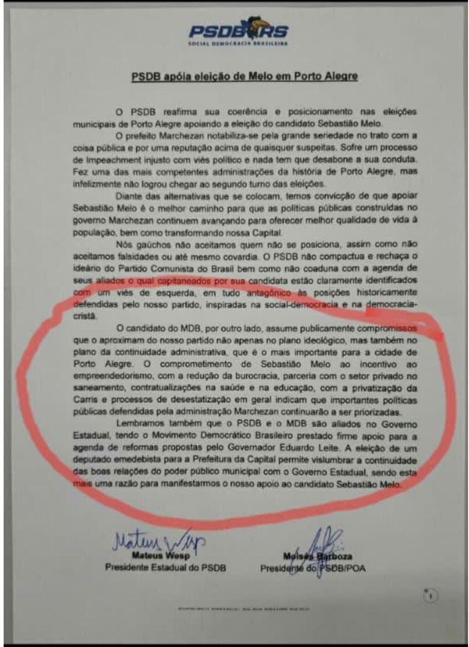 Demissão de cobradores, privatização da saúde, da educação; privatização da água e do transporte público e até pedágio nas ruas do centro o Melo garante pros tucanos. Olha o que diz o documento da direção do PSDB do Marchezan que tá circulando entre os filiados pra pedir apoio ao cara que acende uma vela pra deus e outra pro diabo. literalmente, já que também tá grudado no Bolsonaro.