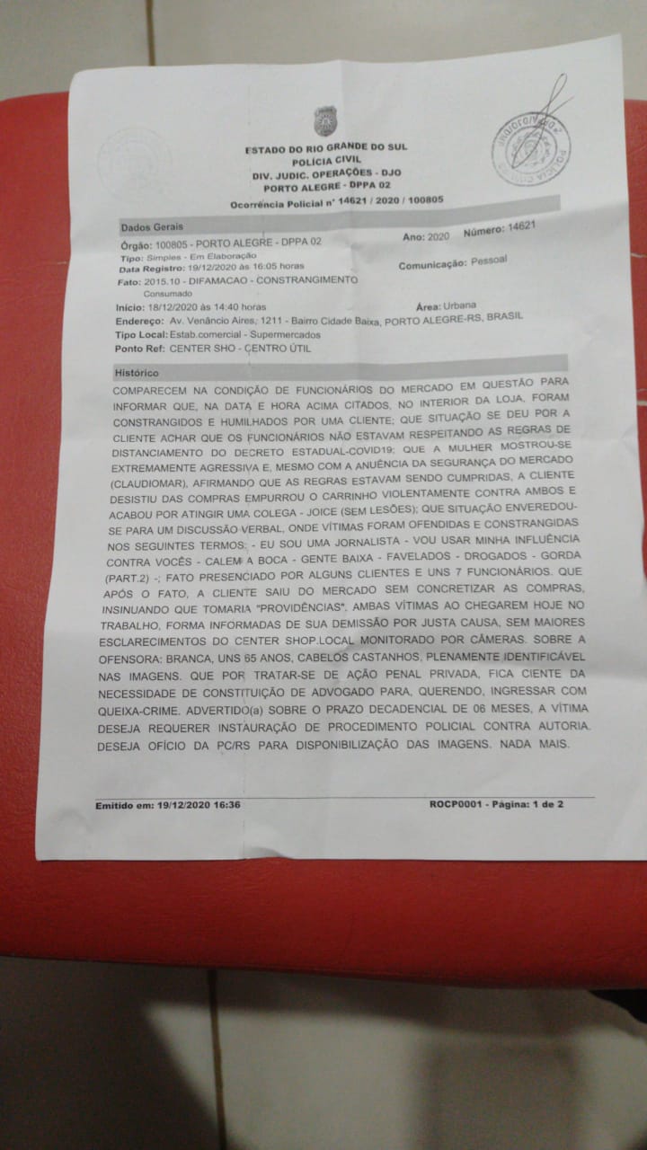 O Boletim de Ocorrência não deixa dúvidas. Uma Jornalista exalou todo seu preconceito contra trabalhadores do Center Shop em Porto Alegre. Termos como “Gente baixa”, “favelados”, “gorda” foram registrados no BO. Mas a Prepotente “jornalista” foi mais longe: “Lascou o “vou tomar providências contra vocês”. O Super mercado é claro, tomou as providências esperadas de quem cultiva o preconceito: Os trabalhadores(as) envolvidos foram demitidos e por justa causa, as vésperas do Natal. Depois de anos trabalhados para a mesma empresa, sempre cumprindo as regras da mesma, embora os salários baixos, não foram suficientes para se contrapor ao preconceito que viceja e parece se ampliar a cada dia no Brasil.