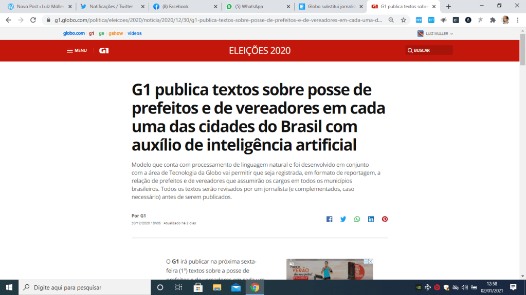 O portal G1, da Rede Globo, anunciou para este 1º de janeiro de 2021 o emprego de robôs na produção de texto jornalístico. O uso da inteligência artificial (AI) começará na posse de prefeitos e de vereadores em cada um dos 5.568 municípios brasileiros.